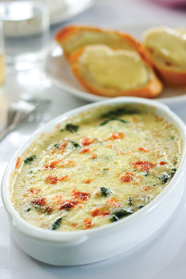Mai întâi speli frunze de spanac foarte bine și le pui la scurs. Topești untul într-o cratiță, adaugi ceapa tocată mărunt și lași până se înmoaie puțin. Adaugi frunzele de spanac și lași până se înmoaie, condimentezi cu puțină sare, după care dai deoparte și lași să se răcească. Pui spanacul într-un vas termorezistent uns cu unt și presari deasupra cașcavalul ras.