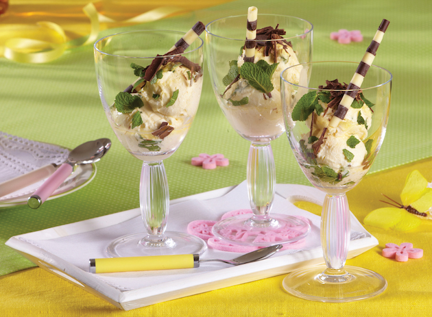 Împarți înghețata în cupe, împreună cu frunzele de mentă tocate. O decorezi cu așchii și bețișoare de ciocolată.