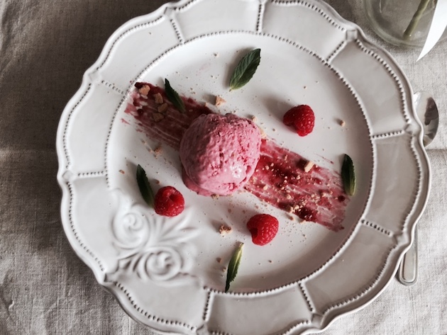 Speli zmeura, o pui în blender și o mărunțești puțin. Adaugi apoi brânza mascarpone, mierea, frunzele de mentă și pulsați de 2-3 ori. O poți da celui mic și așa, dar o poți pune și în congelator.