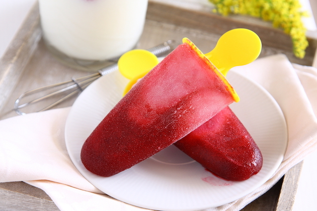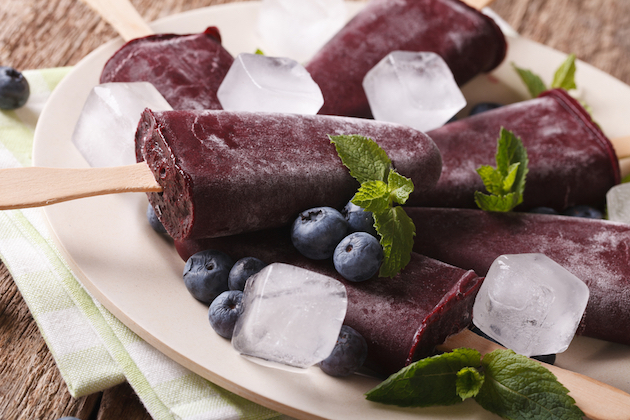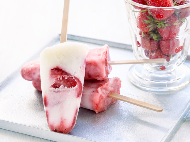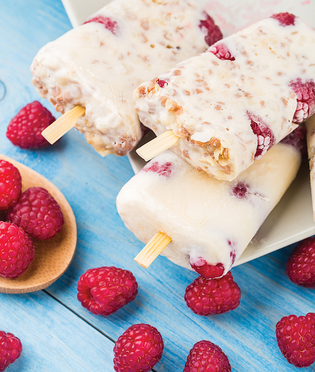Amesteci 400 g iaurt cu 2 banane, 200 g caise bine coapte și 100 g zmeură, toate pasate. Zmeura e bine să o treci printr-o sită ca să îndepărtezi semințele. Torni compoziția în forme și o îngheți.