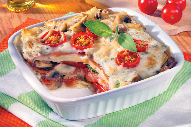 Torni puțin din sosul rece într-un vas termorezistent și acoperi cu foi de lasagna nefierte. Așezi felii groase de roșii, presari puțin busuioc și usturoi tocate fin. Urmează un strat de ciuperci tăiate felii, ceapă tocată mărunt, brânză și mozzarella rase și amestecate în prealabil.