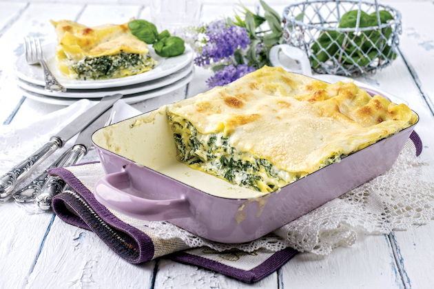 700 g spanac congelat; 2 căței usturoi; 1 legătură mărar verde; 60 g unt; 110 g brânză Feta; 45 g cașcaval mai tare; 750 ml lapte; 2 ouă; 30 g parmezan; 45 g făină; 8 foi de lasagna; 1 vârf de cuțit scorțișoară; 1 vârf de cuțit nucșoară rasă;