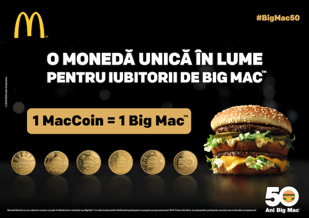Disclaimer: Moneda MacCoin nu are valoare în numerar și poate fi utilizată doar în schimbul unui Big Mac, în cadrul restaurantelor McDonald’s participante la campanie pe parcursul anului 2018. Pentru lista țărilor și restaurantelor participante, accesați www.mcdonalds.ro/regulament.