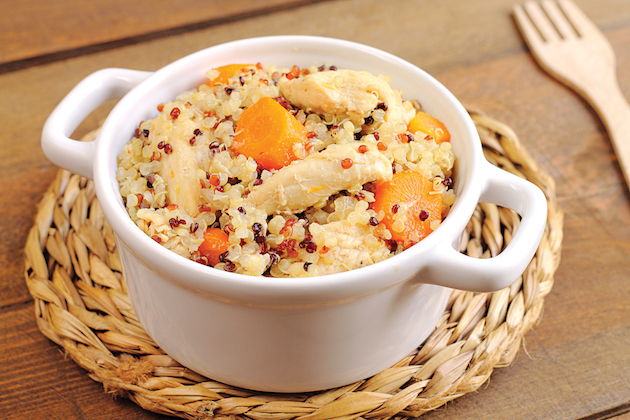 Adaugi peste legume quinoa spălată bine, supa de pui, salvia, acoperi cratița cu un capac  și lași să fiarbă, la foc mic, 20 de minute. Trebuie ca quinoa să absoarbă tot lichidul și să se înmoaie.