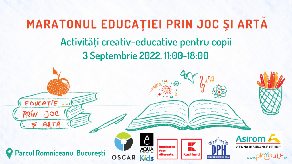 Asociatia PlaYouth organizează în data de 3 septembrie în Parc Romniceanu-Cotroceni, în intervalul orar 11:00-18:00, Maratonului Educației Alternative. Pe lângă învățarea prin joc și artă, evenimentul are și un obiectiv caritabil – acela de a contribui la implementarea proiectului “Biblioteca cu speranță” pentru copiii din zonele defavorizate și a strânge rechizite școlare, ghiozdane și materiale educaționale pentru cei 500 de copii din zonele sărace ale Bucureștiului în cadrul Caravanei ABECEDAR.