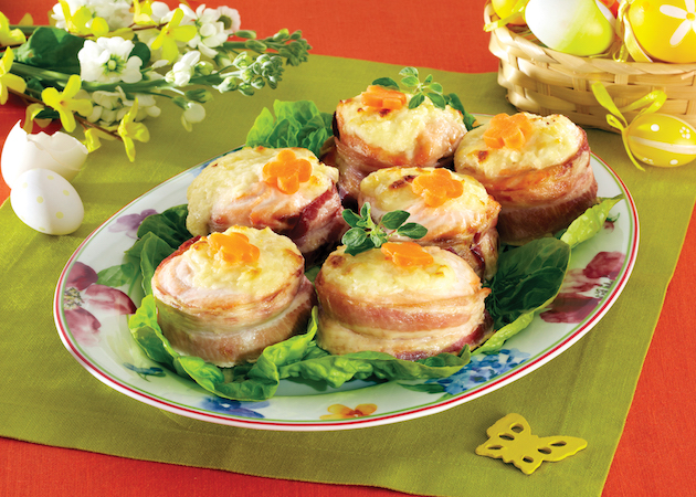 Tăvălești fiecare rulou prin făină, le învelești în feliile de pancetta sau de bacon și le fixezi cu scobitori sau le legi cu sfoară alimentară.