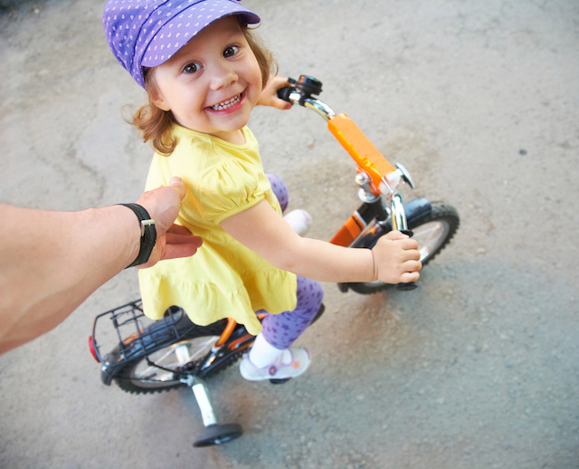 Când copilul tău se simte confortabil mergând cu bicicleta cu roți ajutătoare, poți începe antrenamentul fără ele. Așezat în șaua bicicletei, exersează reacțiile de protecție ale copilului mișcând bicicleta dintr-o parte în alta și rugându-l să pună piciorul pe pământ pentru protecție. Antrenamentul poate fi continuat și prin scoaterea pedalelor de pe bicicletă. Copilul se va putea mișca apoi propulsându-se cu cele 2 picioare și ridicându-le pentru a continua rularea. În acest fel, el poate începe să experimenteze ajustările posturale necesare pentru a-și menține echilibrul.