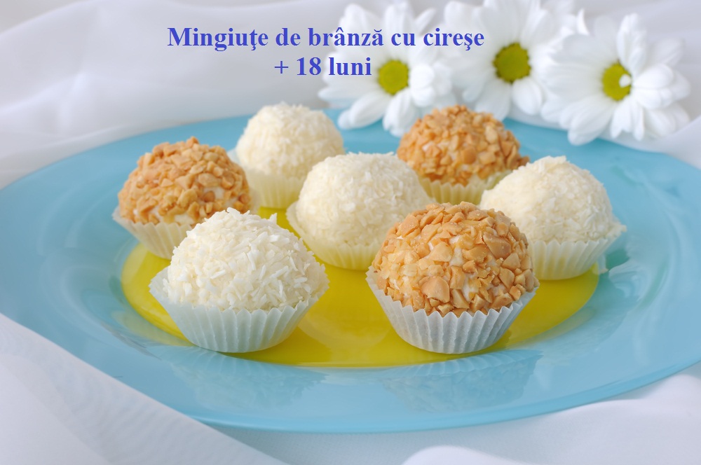 Iei cu lingura din compoziţia de brânză, aşezi în mijloc o cireaşă fără sâmbure şi cu mâinile unse cu puţin ulei îi dai forma unei mingiuţe, o tăvăleşti prin nucă de cocos şi o aşezi pe un platou. Procedezi la fel până se termină toate ingredientele.