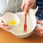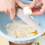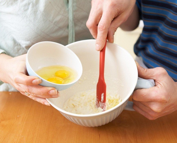 Amesteci brânza de vaci cu brânza de capră rasă, adaugi ouăle, iaurtul, laptele şi omogenizezi.