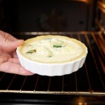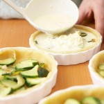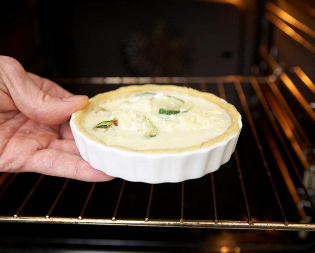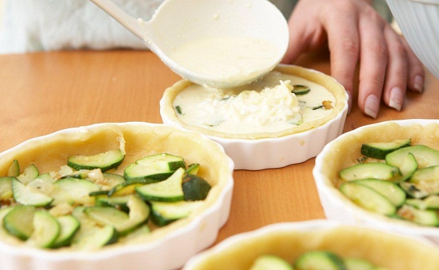 Înţepi aluatul din forme cu furculiţa, împarţi dovleceii şi torni în fiecare compoziţia de brânză.