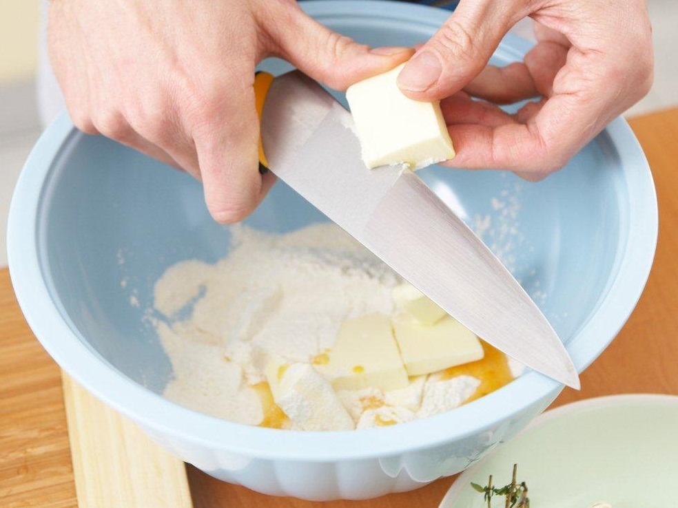 Cerni făina într-un castron cu praful de copt, adaugi untul tăiat cuburi, oul, apa și sarea. Frămânţi un aluat neted, îl înveleşti în folie și-l laşi dai la frigider o oră.