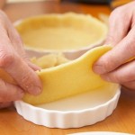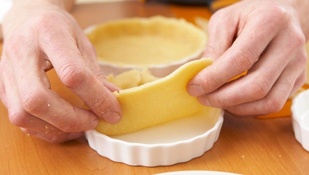 Întinzi din aluat o foaie groasă de 2 mm şi tai din ea 4 cercuri de 12 cm în diametru, cu care îmbraci 4 forme de minitarte unse cu unt.