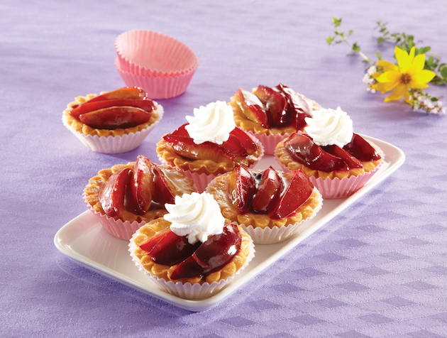 Speli prunele, le scoți sâmburii și le tai sferturi. Le așezi într-un vas termorezistent și le introduci în cuptor pentru 5 minute. Așezi prunele în tarte și deasupra torni jeleul preparat conform indicațiilor de pe ambalaj. Le introduci la frigider până se întărește jeleul și le servești cu frișcă.