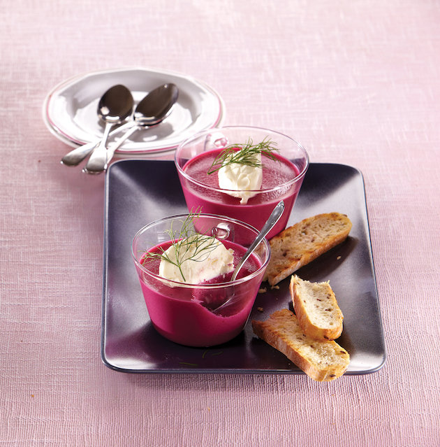 Faci din sfecla roșie un piure și o amesteci cu smântâna și hreanul. Adaugi smântâna dulce cu gelatina, puțină sare și omogenizezi cu mixerul. Torni crema în boluri mici și le introduci în frigider să se întărească.