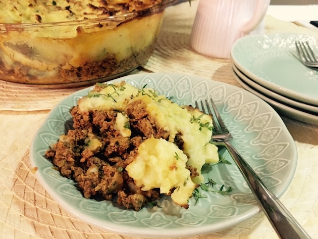 Pui carnea și legumele într-un vas termorezistent uns cu unt. Amesteci piureul cu cașcavalul ras și îl întinzi deasupra amestecului de carne. O introduci în cuptorul încins la 180ºC pentru 30 de minute, până când piureul începe să se rumenească ușor deasupra.