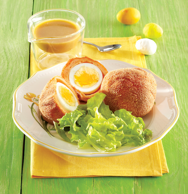 Pasezi somonul afumat și-l amesteci cu gălbenușurile. Tăvălești ouăle mai întâi prin făină, apoi prin amestecul de somon. La final le tăvălești prin pesmet. Le prăjești în baie de ulei încins 5 minute.