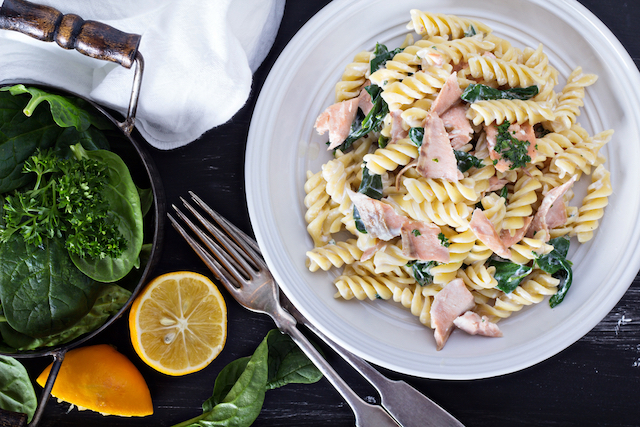 Fierbi pastele în apă clocotită conform indicațiilor de pe ambalaj, după care le scurgi. Separat, fierbi 10 minute somonul în apă clocotită cu sare, după care îl lași să se răcească și îl rupi bucăți.