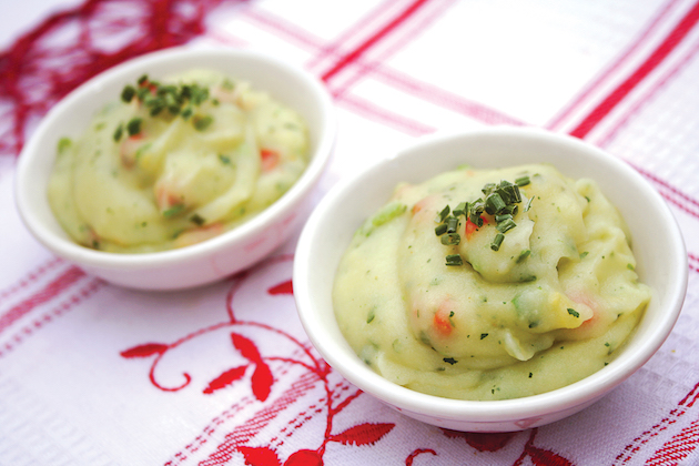 Cureți cartoful și morcovul și le speli bine. Cartoful îl tai cubulețe, le pui într-o crăticioară împreună cu morcovul întreg, acoperi totul cu apă plată și o așezi pe foc. Lași să fiarbă până legumele se înmoaie, circa 20 de minute.