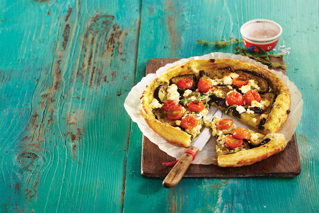 Întinzi aluatul în formă rotundă de 3 mm grosime. Așezi blatul pe o tavă cu hârtie de copt. Îl ungi uniform cu sosul pesto, lăsând puțin loc pe margini, și îl acoperi cu felii de vânătă. Deasupra pui roșiile tăiate jumătăți și brânza feta fărâmițată. Presari totul cu puțină sare și piper și tragi marginile aluatului peste umplutură, pe care le ungi cu ulei de măsline.
