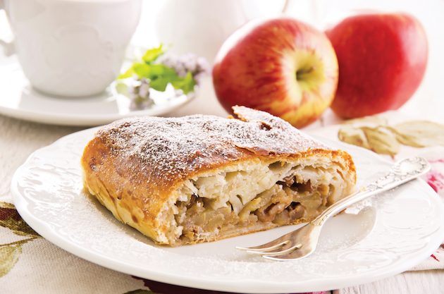 Împarți aluatul în două și întinzi două foi subțiri. Împarți umplutura de mere și rulezi. Așezi ruladele într-o tavă în care pui hârtie de copt, le ungi cu ulei și le introduci în cuptorul încălzit la 220ºC pentru 30 de minute. Lași ștrudelul să se răcească.