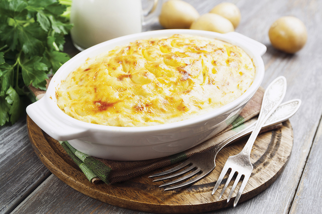 Scurgi cartofii de zeamă și îi pasezi, adaugi 3 linguri cu unt, laptele, puțină sare și piper și omogenizezi. Ungi un vas termorezistent mai mic cu unt, pui pe fund amestecul de carne, iar deasupra întinzi piureul de cartofi. Introduci vasul în cuptorul preîncălzit la 200º C pentru 30 de minute. Lași plăcinta să se răcorească și o servești.