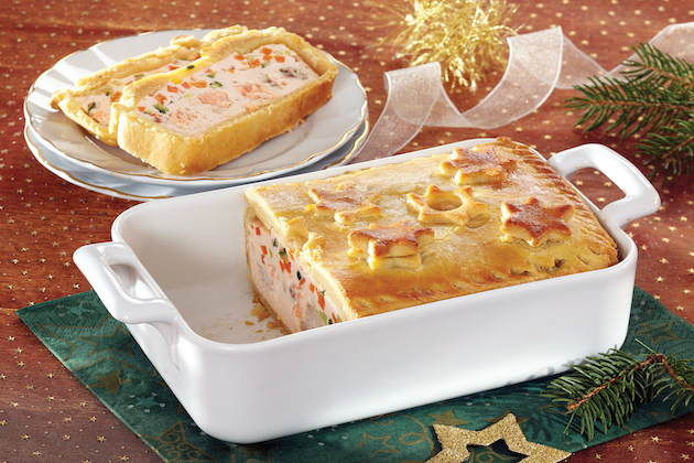 PENTRU ALUAT: 200 g unt; 380 g făină; sare; 2 gălbenușuri. PENTRU UMPLUTURĂ: 1 morcov mare; 150 g broccoli; 400 g file de somon; 200 g file de crap; 200 ml smântână (12% grăsime); 1 ou; 1 lingură mărar tocat