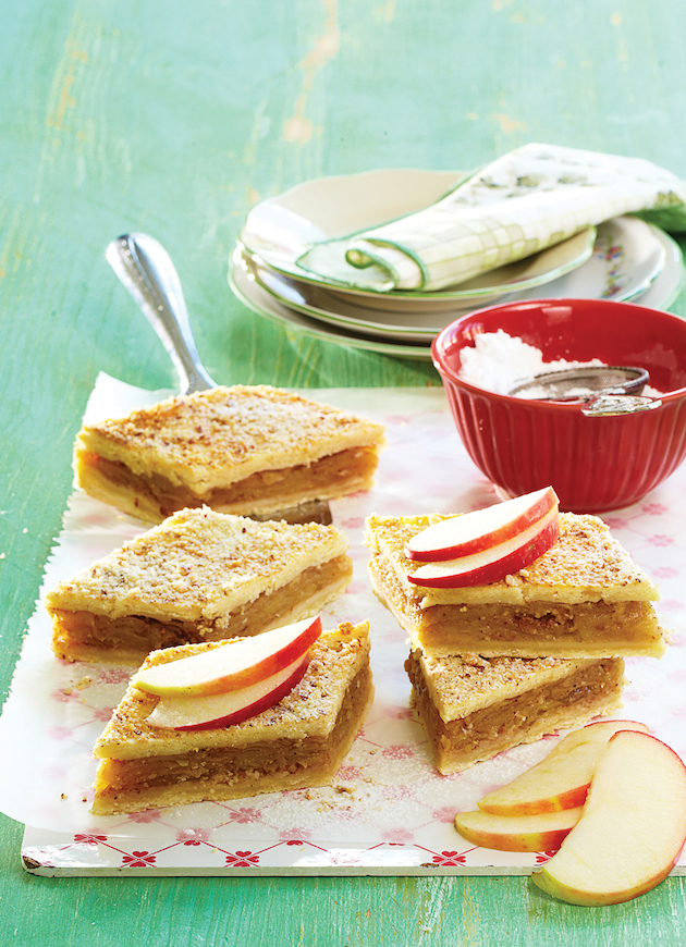 Lași prăjitura să se răcească, o tai romburi sau pătrate, pe care le presari cu zahăr pudră și migdale măcinate.
