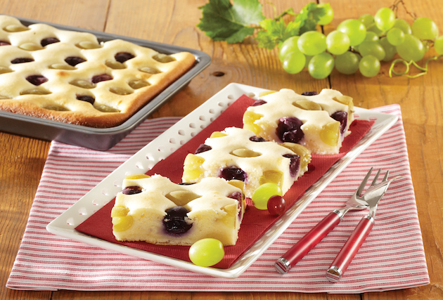 Pui aluatul într-o tavă de 30×24 cm unsă şi tapetată, aşezi deasupra boabele de struguri spălate şi uscate şi o introduci în cuptorul încins la 180°C timp de 30 de minute. Laşi prăjitura să se răcească, o tai bucăţi şi o serveşti.