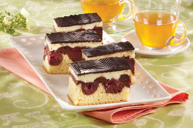 Împarți aluatul în două și în una din părți pui cacaua. Întinzi aluatul alb într-o tavă de 30×40 cm îmbrăcată cu hârtie de copt și apoi pe cel maro. Deasupra pui cireșele sau vișinele. Introduci tava în cuptorul încins la 160º pentru 45 minute. O scoți și o lași să se răcească.