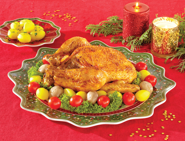 Dai tigaia deoparte de pe foc, adaugi brânza rasă, busuiocul și pasta de ardei roșu. Umpli puiul cu amestecul de ciuperci și coși deschizătura. Așezi puiul într-un vas termorezistent și îl ungi cu untul topit rămas. Îl introduci în cuptorul încins la 180°C până devine auriu (circa 70 de minute). Îl servești cu cartofi fierți mici sau cu ce fel de garnitură îți place.