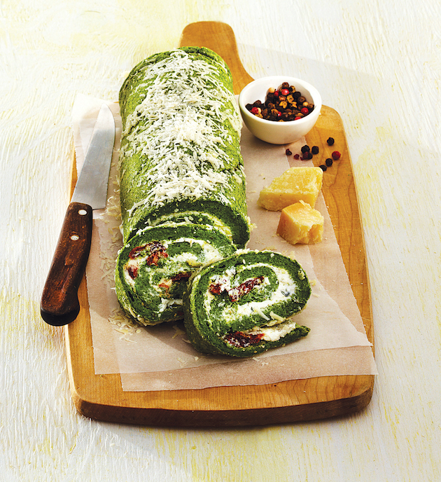 Amesteci brânza cu usturoiul pisat și cu puțină sare. Întinzi crema pe blat, presari roșiile uscate și rulezi. La final, presari rulada cu parmezan ras. O dai la rece până o servești.