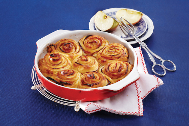 Întinzi foitajul în dreptunghi, îl ungi cu gemul de caise și presari scorțișoara. Îl tai în 8 fâșii pe lung. Așezi pe marginea fiecărei benzi, pe lung, feliile de mere, ușor suprapuse, după care rulezi cât mai strâns.