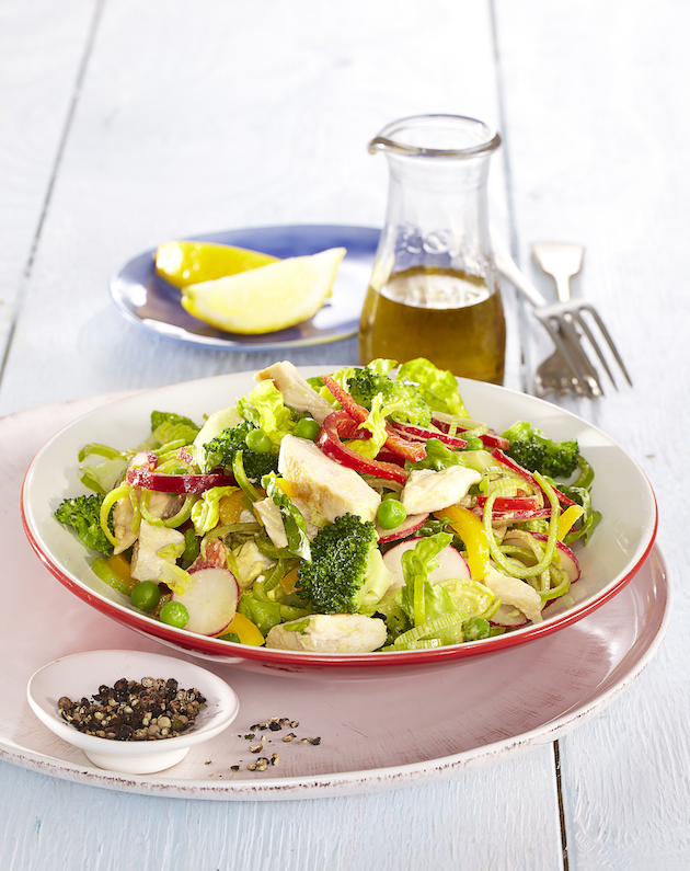 Adaugi peste pui, mazăre și broccoli castravetele curățat de coajă și tăiat felii, ardeiul și prazul tăiate fâșii subțiri. Pui ridichile tăiate felii și amesteci ușor toate ingredientele.