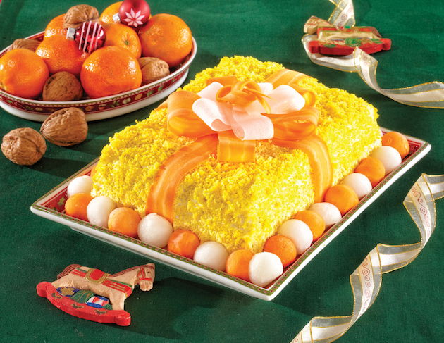 Razi gălbenușurile și cureți de coajă morcovii și ridichea. Cu un curățător de legume le tai felii subțiri. Presari salata cu gălbenușul ras și deasupra formezi o fundă din legume (ca în imagine).