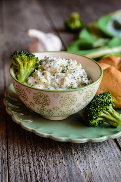 Adaugi peste broccoli crema de brânză amestecată înainte cu iaurtul, usturoiul pisat, sare, după gust, și amesteci. Servești salata ca aperitiv, cu pâine.