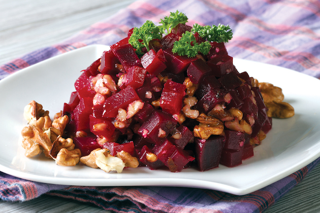 Lași sfecla fiartă să se răcească, o cureți de coajă, o tai cubulețe și o pui într-un castron. Dacă vrei ceva mai fin, dai sfecla pe răzătoarea mare. Adaugi peste sfeclă nuca, usturoiul și amesteci.