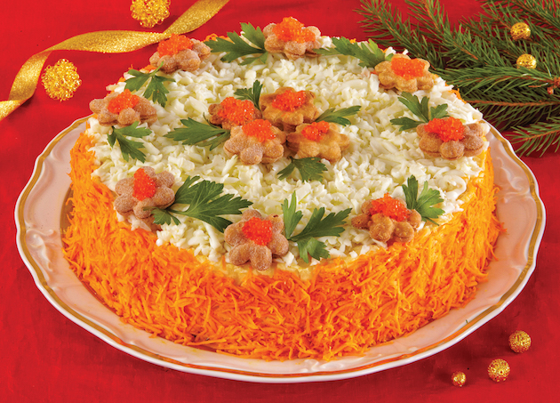Cureți morcovii de coajă și îi dai pe răzătoarea mică, iar albușurile le toci mărunt. Îmbraci marginile salatei cu morcov ras, iar deasupra pui albușurile. Decorezi deasupra cu biscuiți, icre și frunze de pătrunjel (ca în imagine).