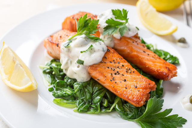 Somon cu spanac și sos de capere pentru o cină delicioasă în familie. Spanacul aduce prospețime în farfurie, iar sosul de capere înnobilează totul.