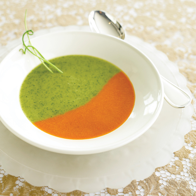 Într-o altă cratiță, se procedează la fel cu ardeii verzi și ingredientele rămase. Se mixează supele, separat, cu blenderul. Condimentezi cu sare fiecare supă, împarți fiecare supă în farfurii, având grijă să nu le combini.