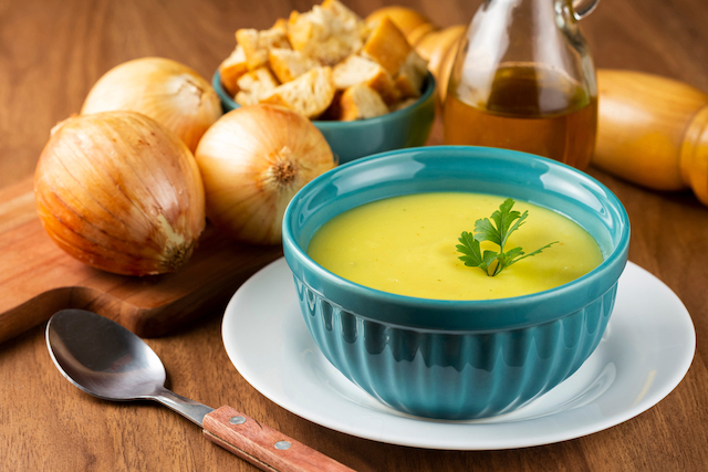 Cureţi ceapa, o speli bine, o toci mărunt, după care o pui într-o oală mai mică cu două linguri de unt topit și cu turmericul. Adaugi 200 ml de supă caldă, cartofii tăiați cubulețe şi laşi să fiarbă 5 minute din momentul în care dă în clocot.