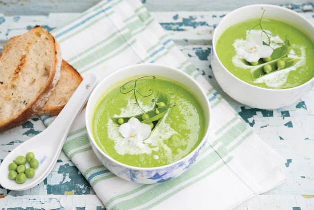 Pui 1 litru din supa strecurată din nou pe foc și când dă în clocot adaugi mazărea. Lași până când mazărea este bine fiartă. Introduci blenderul în oală și o pasezi foarte fin. Adaugi smântâna dulce, untul, menta, busuiocul și mixezi din nou. Guști supa și dacă este nevoie mai pui puțină sare. După ce ai pasat crema, așezi oala pe foc mic pentru încă cinci minute. O servești caldă cu puțină smântână și ulei de măsline deasupra.