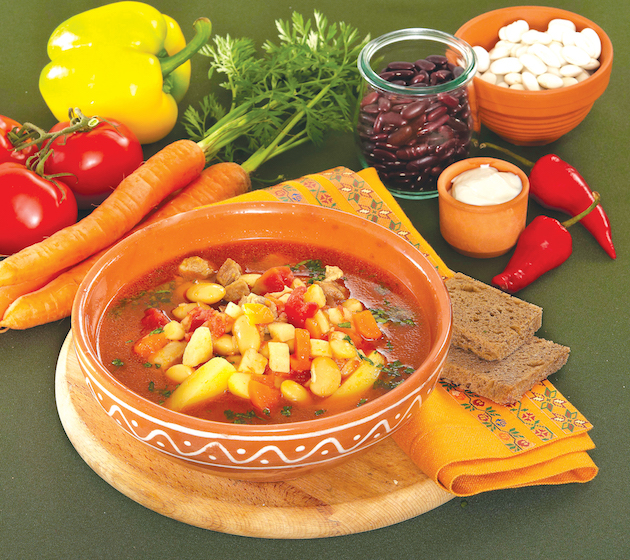 Când fasolea este fiartă, adaugi peste ea legumele prăjite, carnea și cartofii și lași să fiarbă circa 15 minute. Mai pui sare dacă mai este nevoie și oprești focul. Pui pătrunjel și leuștean verde tocate mărunt și acoperi cu un capac.
