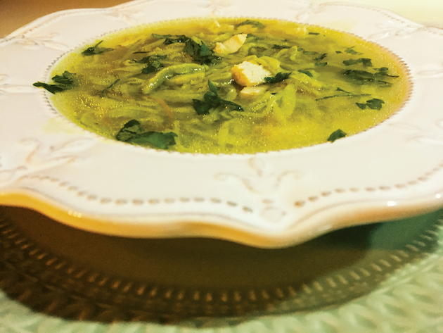 Speli pieptul de pui și îl pui la fiert în apă. Îl lași să dea într-un clocot, scurgi apa și îl pui din nou la fiert în 2 litri de apă împreună cu legumele întregi. Când carnea este fiartă, strecori supa, tai carnea cubulețe și o pui la loc în supă. Adaugi tăiețeii, un morcov ras și uleiul de măsline. Lași 10-15 minute, condimentezi cu sare și piper și oprești focul. O servești cu pătrunjel verde tocat deasupra.