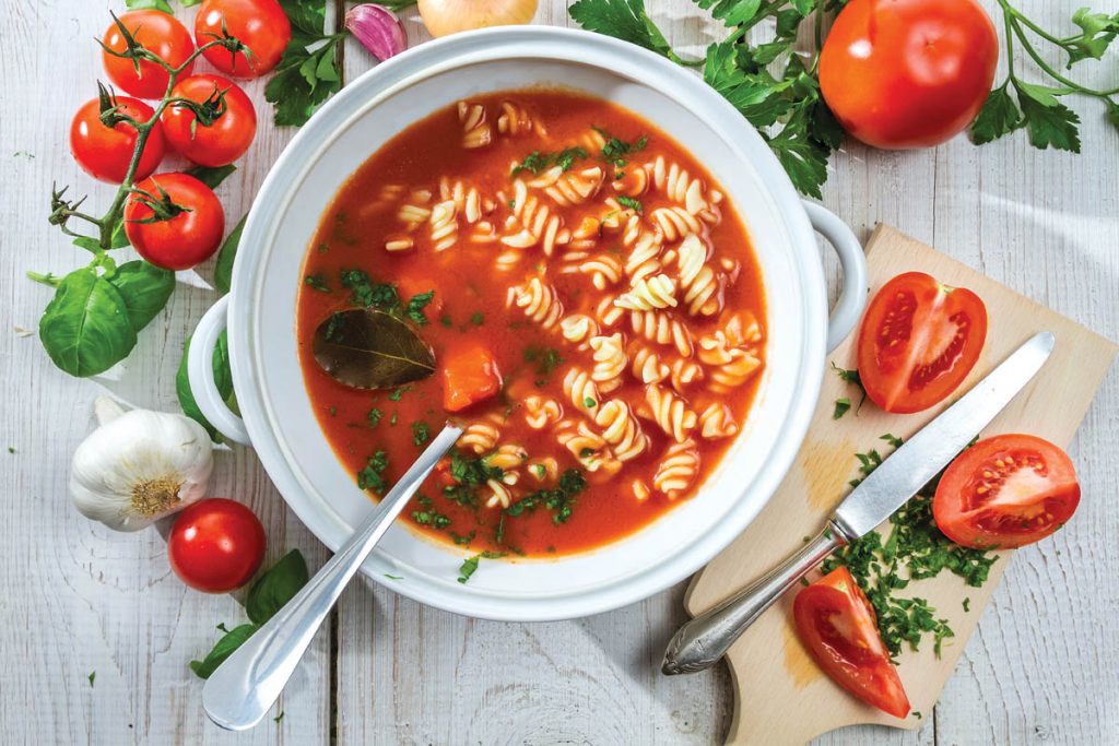 Dacă legumele nu s-au fiert și a scăzut zeama mai adaugi 500 ml de apă, pasta de tomate, zahărul și mai lași să fiarbă cinci minute, la foc mic. Fierbi pastele Băneasa conform indicaţiilor de pe ambalaj și le adaugi în supă. Oprești focul și condimentezi cu sare și piper. Pastele vor absorbi din supă și dacă nu vrei ca aceasta să fie groasă, pui o cantitate mai mică de paste. O servești caldă sau rece, cu pătrunjel verde tocat deasupra.
