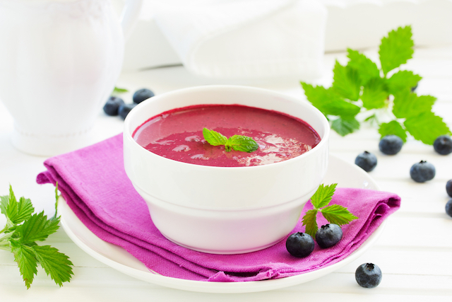 Pui afinele spălate într-un blender, adaugi iaurtul, frunzele de mentă, mierea, sucul de mere și blendezi până obții o supă-cremă fină.