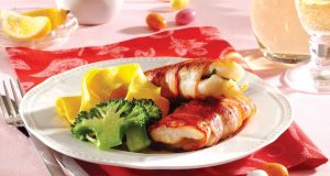 Ingrediente 4 fileuri de somon; 1 lămâie; 3 căței usturoi; 2 lingurițe condimente de pește; sare; 100 g făină; 8 felii de pancetta sau de bacon; 3 linguri ulei de măsline; 200 g brânză topită rotundă; frunze de salată; 1 ...