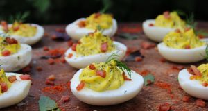 Ingrediente 5 ouă 2 linguri maioneză ½ linguriță muștar ½ lingură miere 4 felii subțiri bacon 2-3 fire mărar verde sare Mod de preparare Mai întâi fierbi ouăle tari, le lași să se răcească și apoi le cureți de coajă. ...