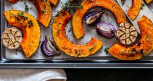 Ingrediente 8 felii potrivite de dovleac 4 linguri ulei de măsline sare de mare mai mare piper proaspăt măcinat 2 cepe roșii 2 căpățâni usturoi 4 crenguțe cimbru proaspăt 3 linguri sirop de arțar Mod de preparare Încingi cuptorul la ...