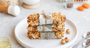 Ingrediente 200 g fulgi de ovăz 100 g zahăr brun 100 g unt 75 g fructe uscate (caise, smochine, stafide, curmale…) 75 g amestec de semințe 2 linguri miere Mod de preparare Preîncălziți cuptorul la 160°C. Într-o cratiță, pui untul, ...