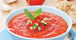 Ingrediente 6 roşii mari bine coapte 2 ardei graşi roşii potriviţi 4 castraveţi mici 3 căţei usturoi 2 cepe mici 50 ml ulei de măsline zeamă de lămâie câteva frunze de busuioc 1 praf de sare cubulețe de ardei și ...
